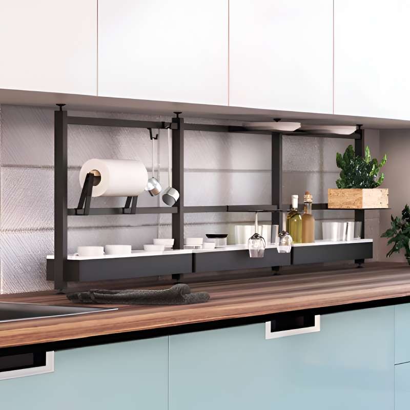 Linero Grid é um sistema modular de organização para cozinhas desenvolvido pela Cucine Oggi. A sua estrutura em alumínio lacado permite aproveitar o espaço entre a bancada e os armários superiores sem necessidade de perfuração.