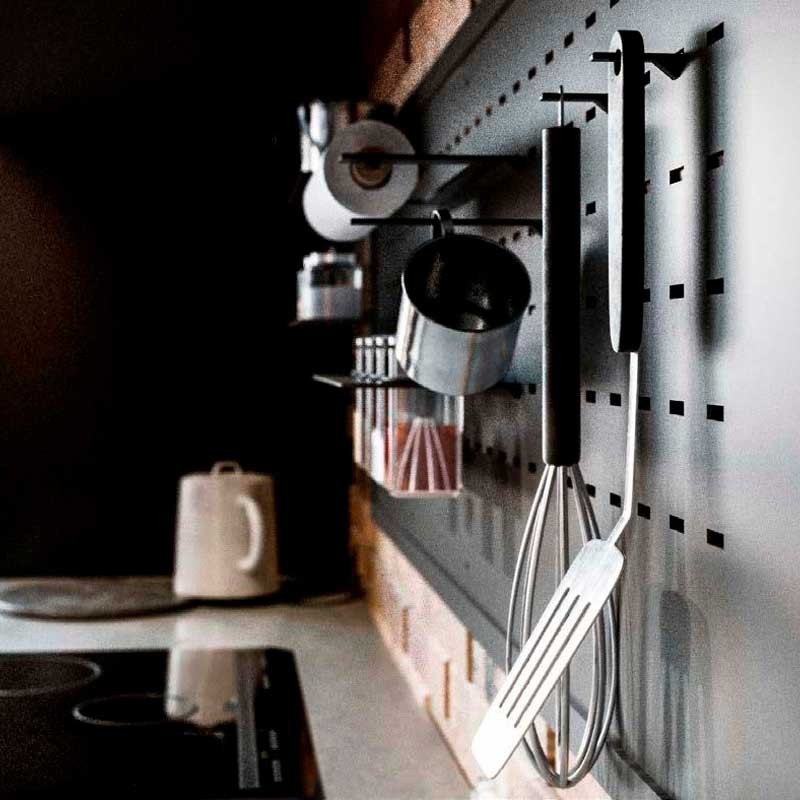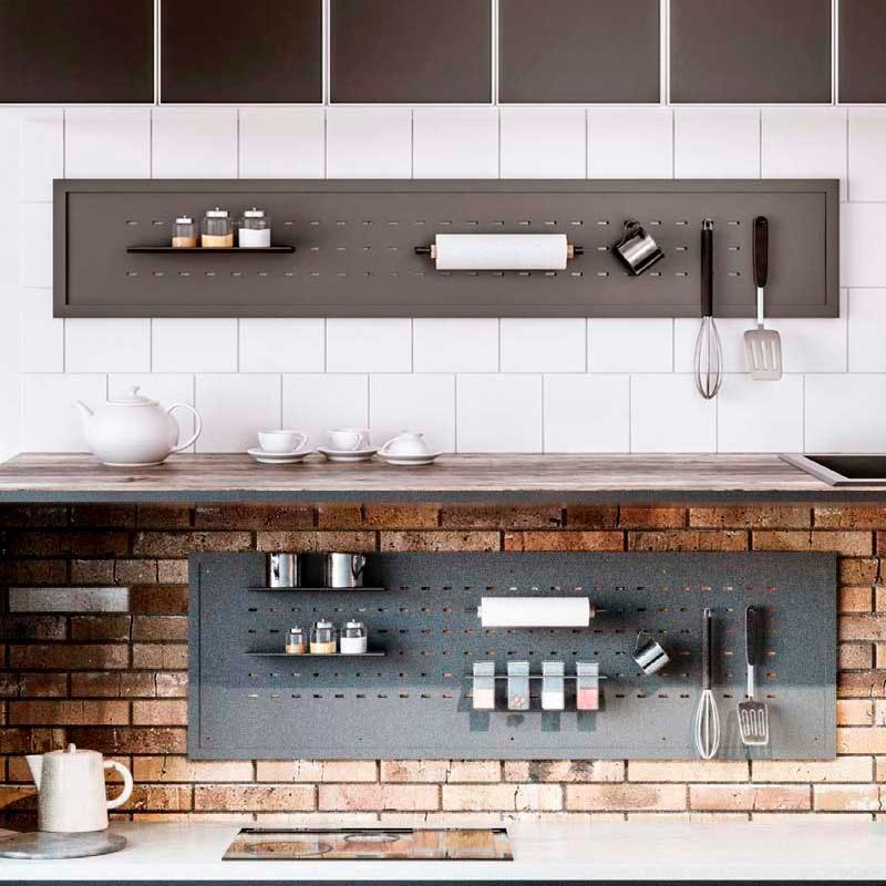 Linero Back é uma placa metálica fina, versátil e modular para instalar em qualquer parede. Perfurando a superfície, permite criar combinações infinitas.