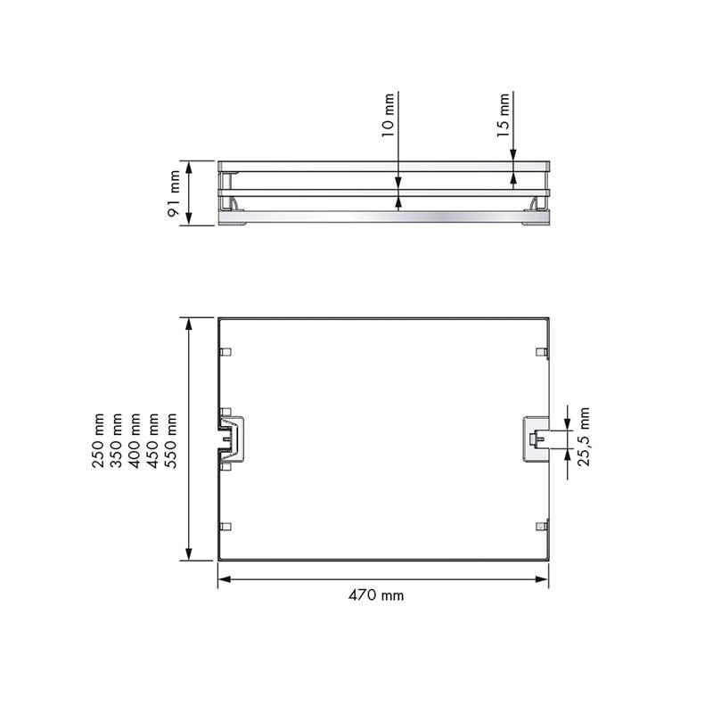 Dependendo da largura de armário onde estão instalados os cestos com sua moldura removível correspondente, eles terão as seguintes dimensões (largura x altura x profundidade):
