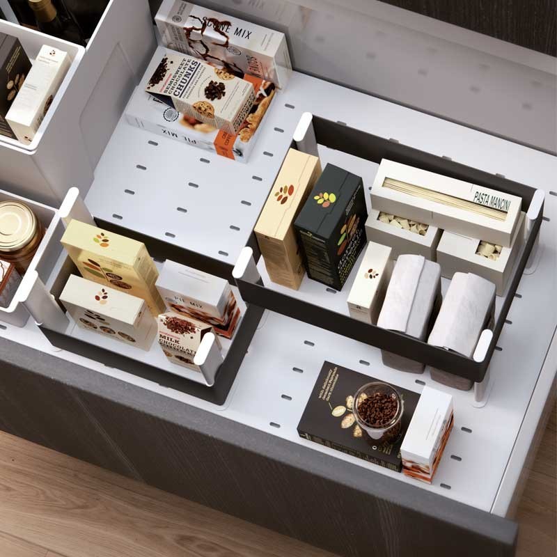 Expanda Kit de armazenamento modelo de Premiere para gavetas extensões de cozinha. Disponível na cor branca ou antracite, e para diferentes medidas de móveis. Inclui divisores e elásticos.