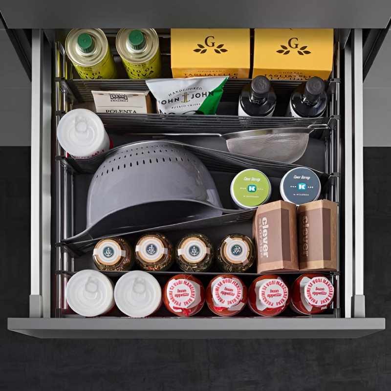 SpaceFlexx® é um sistema de organização extremamente flexível que classifica o interior da gaveta de forma intuitiva e eficiente. Permite aproveitar o espaço disponível e manter tudo em ordem, independentemente do tamanho ou da forma dos artigos armazenados.
