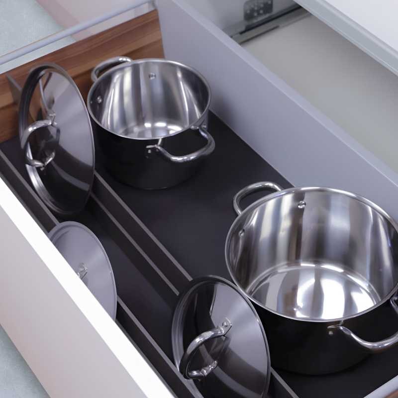 Trata-se de um sistema extremamente prático e flexível, capaz de otimizar ao máximo o espaço interior do gavetão. Para um acabamento perfeito, pode adicionar-se um tapete antiderrapante na base da gaveta (opcional).