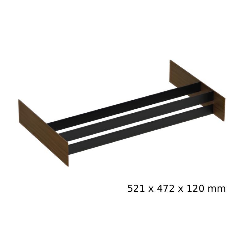 A série BelNet Cuibus é formada por um sistema de divisões horizontais fabricadas em alumínio lacado piombo (antracite) e laterais em laminado compacto folheado a nogueira, desenhadas para organizar de forma eficiente o interior do gavetão. Permite ordenar panelas, frigideiras, tampas e outros utensílios de cozinha de maneira simples e acessível.