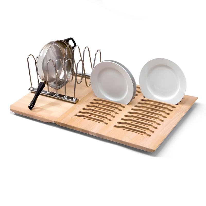 Expanda Set de tabuleiro marítimo em faia com porta-pratos e porta-frigideiras para interior de gaveta de panelas de 900 mm, perfeito para organizar os seus pratos e frigideiras de forma mais eficiente. Indicar modelo da gaveta e medida do lado do móvel (16 mm ou 19 mm) ao fazer o pedido.
