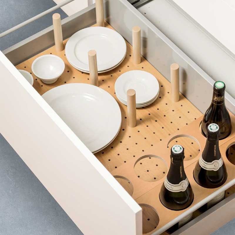 Expanda Sistema de fundos perfurados de 8 mm, para organizar pratos, copos ou frigideiras na sua gaveta de panelas, disponível nas cores faia, nogueira e branco.