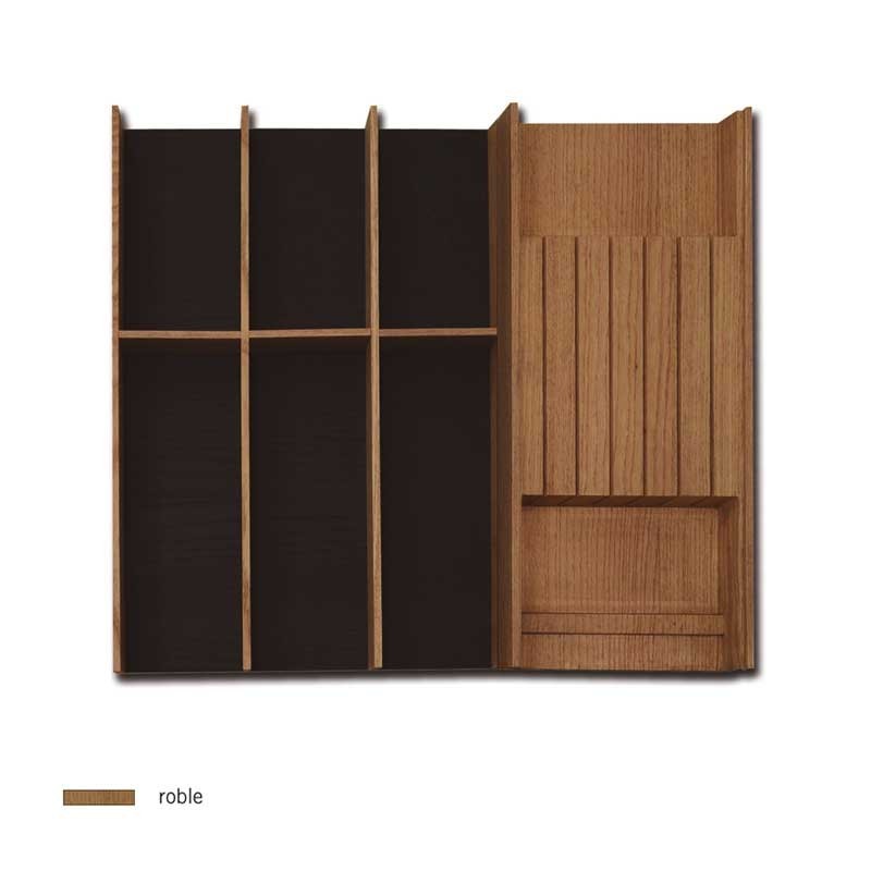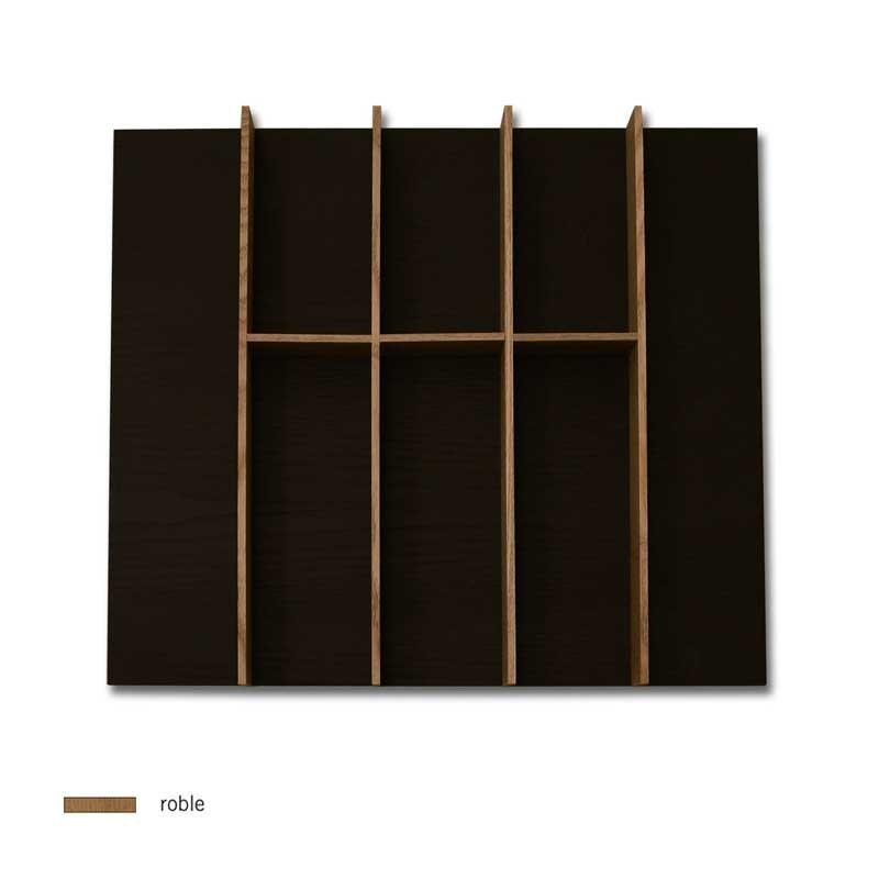 Expanda Porta talheres em madeira de 600 mm modelo Rima com fundo em carvalho envernizado preto de 5 mm e divisórias em carvalho natural. Vários modelos com diferentes acessórios.