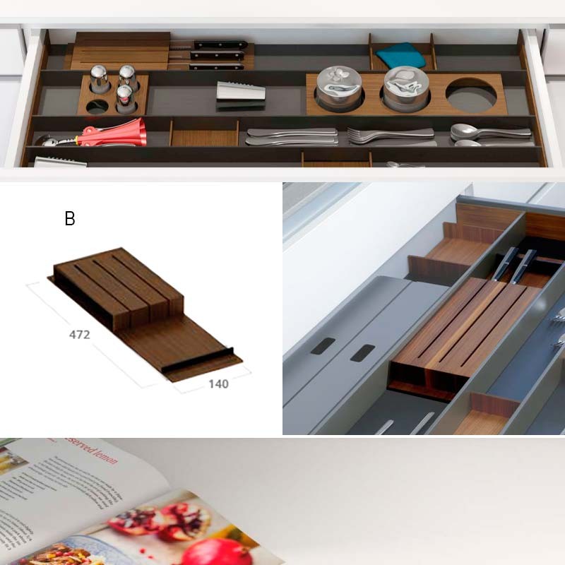 Expanda Série Cuibus consiste em várias divisões de alumínio lacado piombo (antracite) e laminado Nogueira, que divide a gaveta horizontalmente.