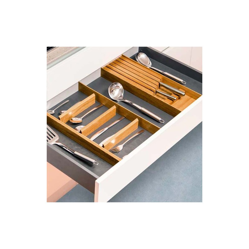 Expanda Ampliação de madeira em forma de L para inserir na parte de trás do talheres, e usar esses talheres em gavetas de guia de até 650 mm de profundidade. Indicar modelo ou medidas internas do de gaveta. A peça pode ser cortada à medida necessária para um ajuste perfeito. Dimensões (A x P x H): 1125 x 150 x 55 mm.