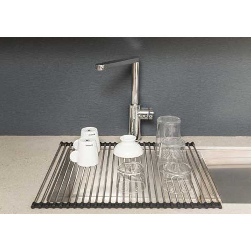 Acessório escorredor para pia rolante em aço inoxidável e borracha de silicone preta.