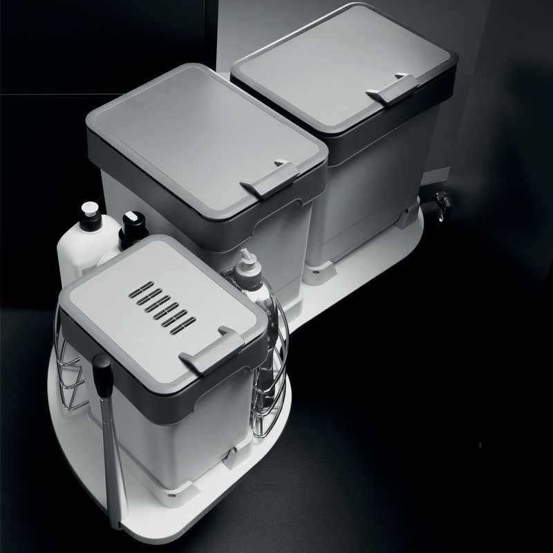 Sistema de contentores de resíduos reversível de extracção completa para rinconero. Os 3 recipientes são fabricados em poliestireno reciclável resistente a altas ou baixas temperaturas, choques, arranhões e a produtos químicos. Este sistema reversível dá a possibilidade de instalar em móveis de canto tanto à esquerda como à direita.