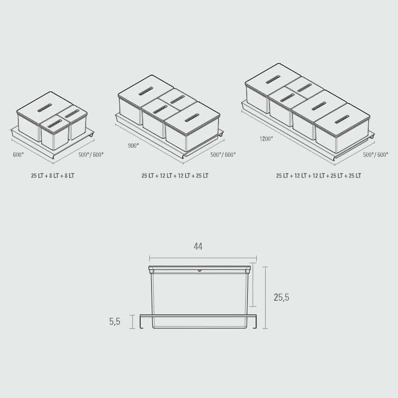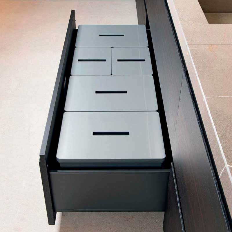 Sistema de gestão de resíduos para gaveta que otimiza o espaço de armazenamento. A base e as tampas são feitas de alumínio fosco anti pegada. Possui um filtro de carbono ativo anti odor para o balde de alimentos orgânicos. Todos os cubos são de PVC de 1ª geração.