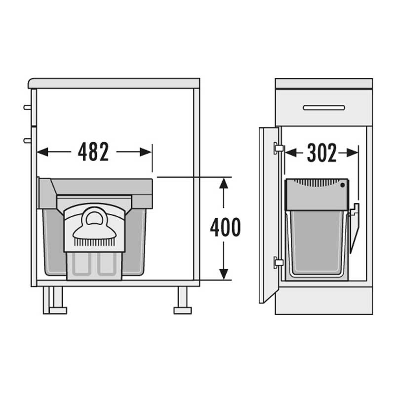 A estrutura destes caixotes do lixo fixa-se à parte inferior (base) dos móveis de cozinha, permitindo uma extração suave dos baldes de forma manual graças às guias laterais incorporadas na parte superior. A tampa ficará fixa no interior do móvel, evitando ter de a levantar manualmente.