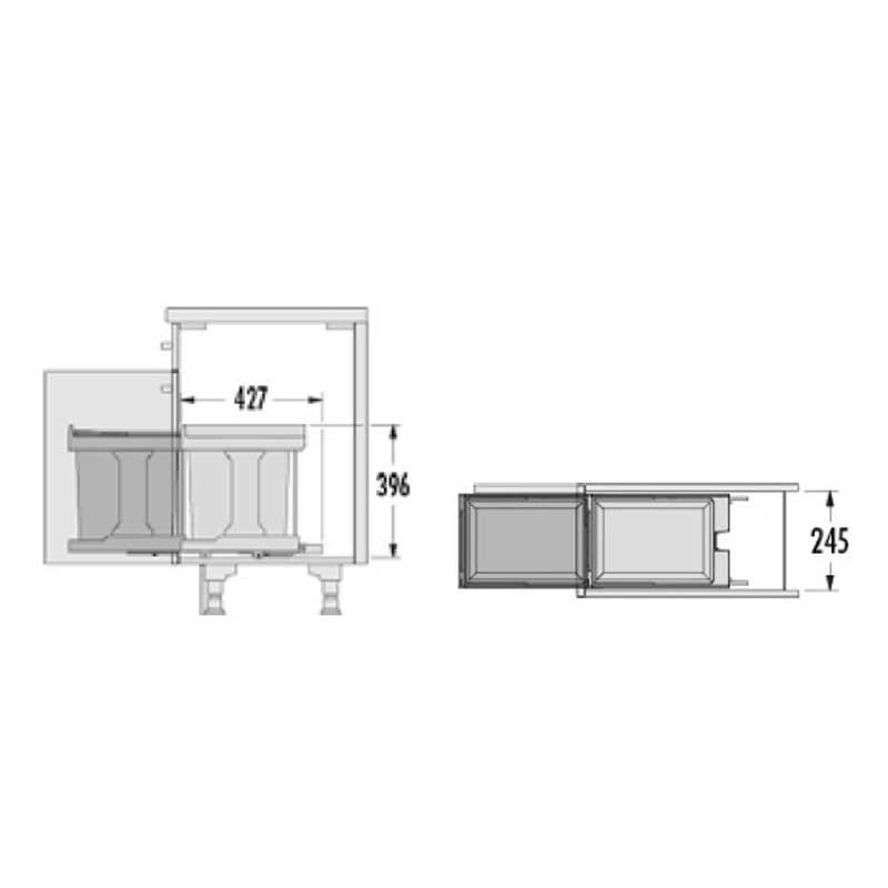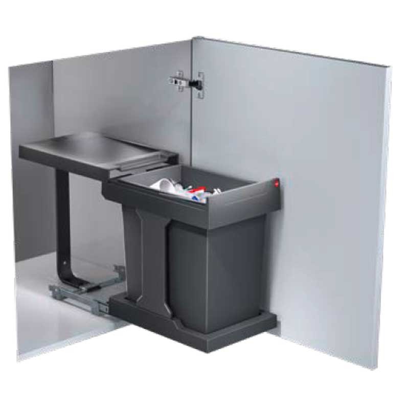 A estrutura destes caixotes do lixo fixa-se à parte inferior (base) dos móveis de cozinha, permitindo uma extração suave dos baldes de forma manual graças às guias laterais incorporadas na parte superior. A tampa ficará fixa no interior do móvel, evitando ter de a levantar manualmente.