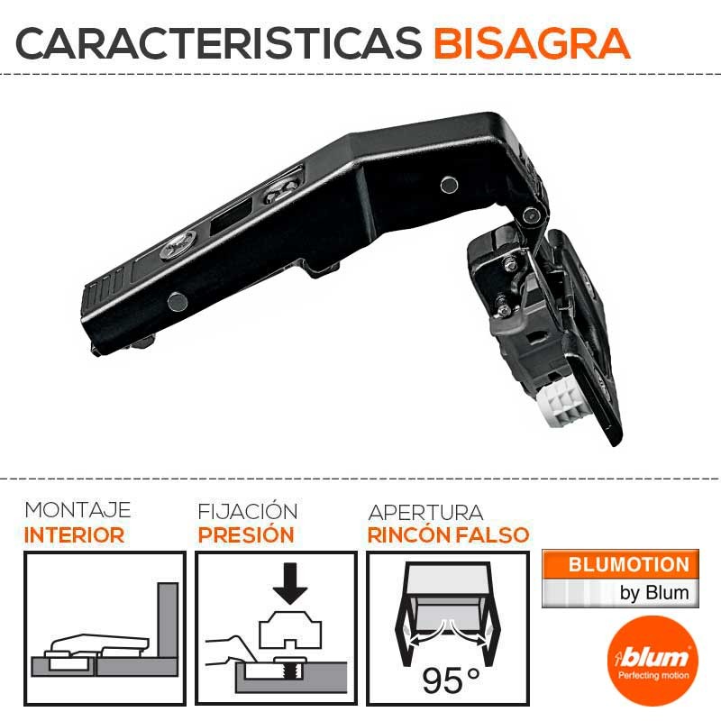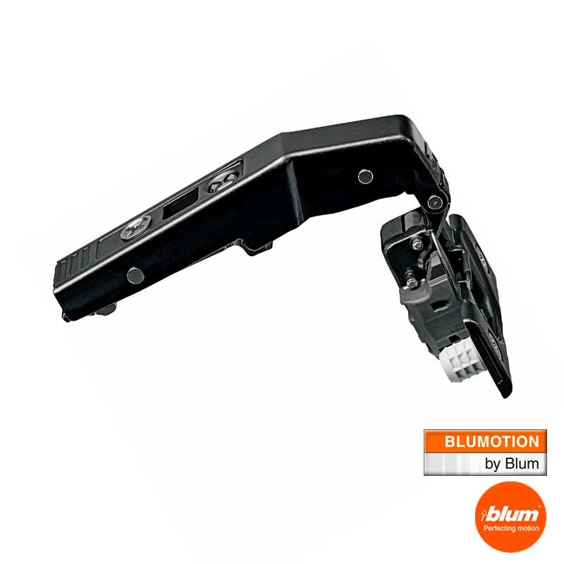 Expanda Dobradiça CLIP Top com sistema de fechamento com retenção BLUMOTION, ângulo de abertura 95º e acabamento preto ônix para portas com cantos falsos.