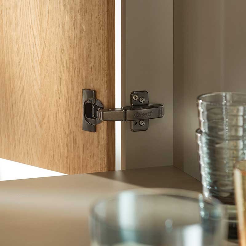 A linha de dobradiças CLIP top e CLIP top BLUMOTION Blum com acabamento preto ônix combina facilmente com móveis escuros, proporcionando um toque sutil de elegância.