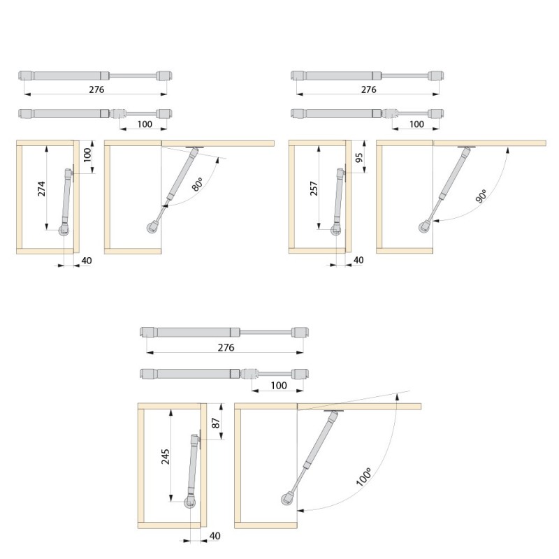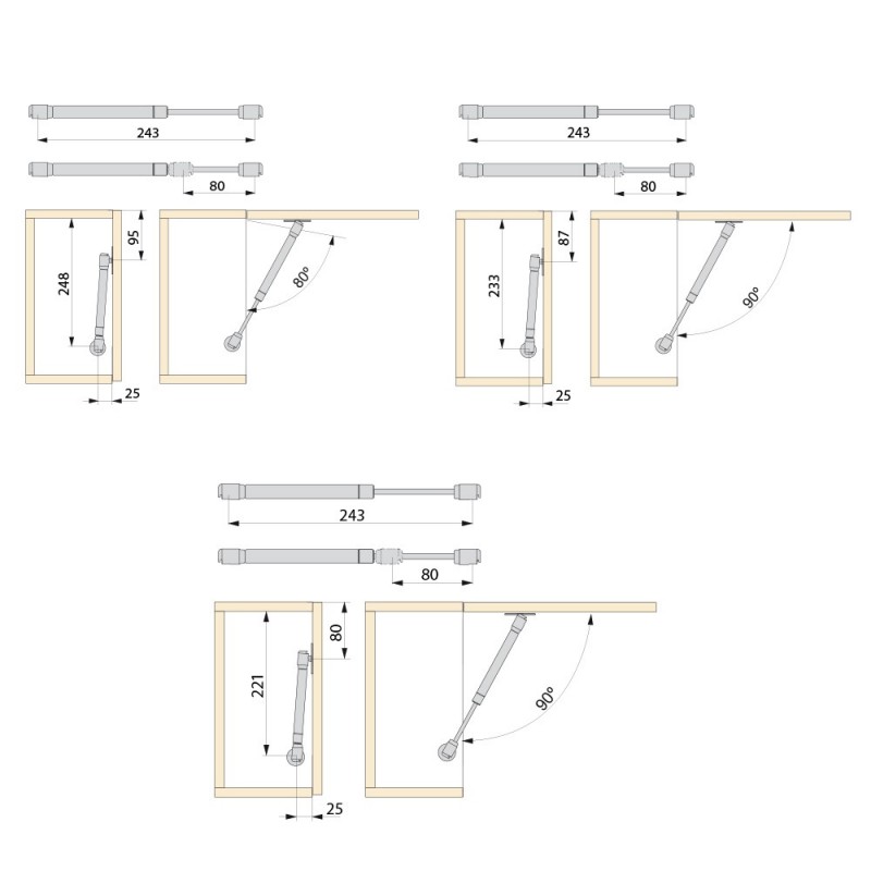 Pistões para móveis que permitem a abertura das portas de madeira ou com moldura de alumínio. Proporcionam uma subida amortecida da porta elevável em móveis de cozinha, casa e banheiro. Esses pistões amortecedores são fornecidos em sacos individuais com instruções de montagem. Cada saco contém um pistão, um encaixe para lateral, um encaixe para porta de madeira, um encaixe para porta com moldura de alumínio e os parafusos necessários.