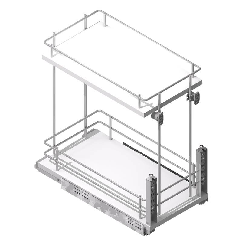 Módulo destacável para móveis de cozinha para armazenamento de garrafas, latas ou outros produtos semelhantes. O projeto da parte inferior incorpora divisões para evitar que as garrafas batam umas com as outras.