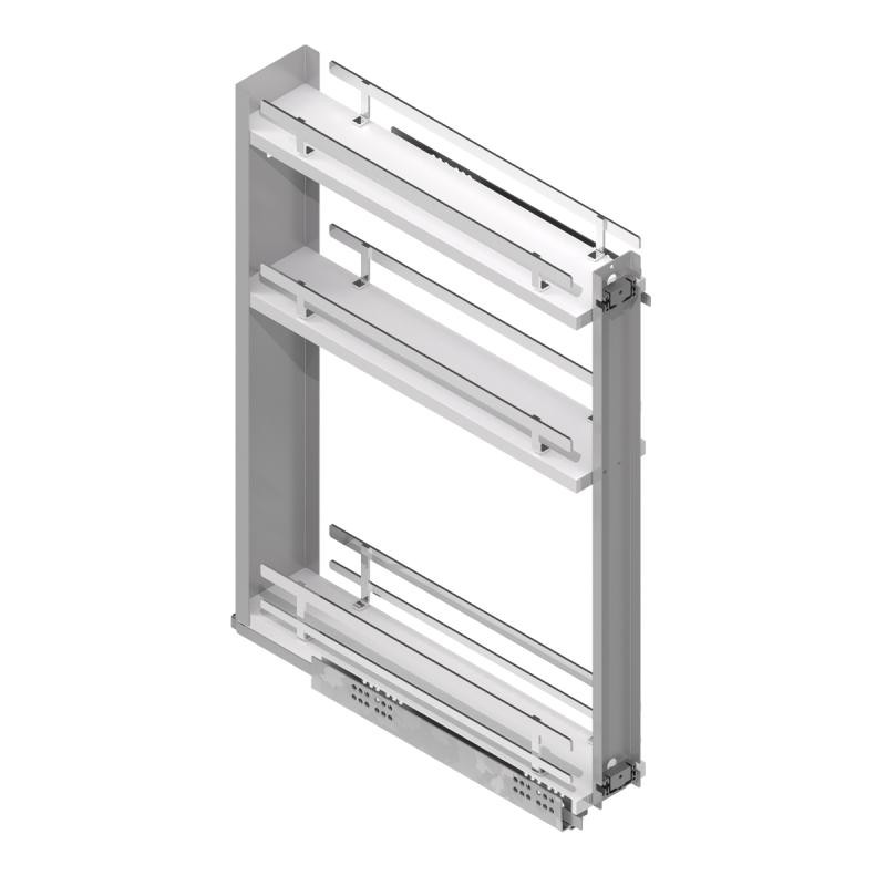 Módulo removível de 3 alturas para móveis de cozinha para o armazenamento de garrafas, latas ou outros produtos semelhantes. O kit inclui elementos separadores para evitar que as garrafas batam umas com as outras.