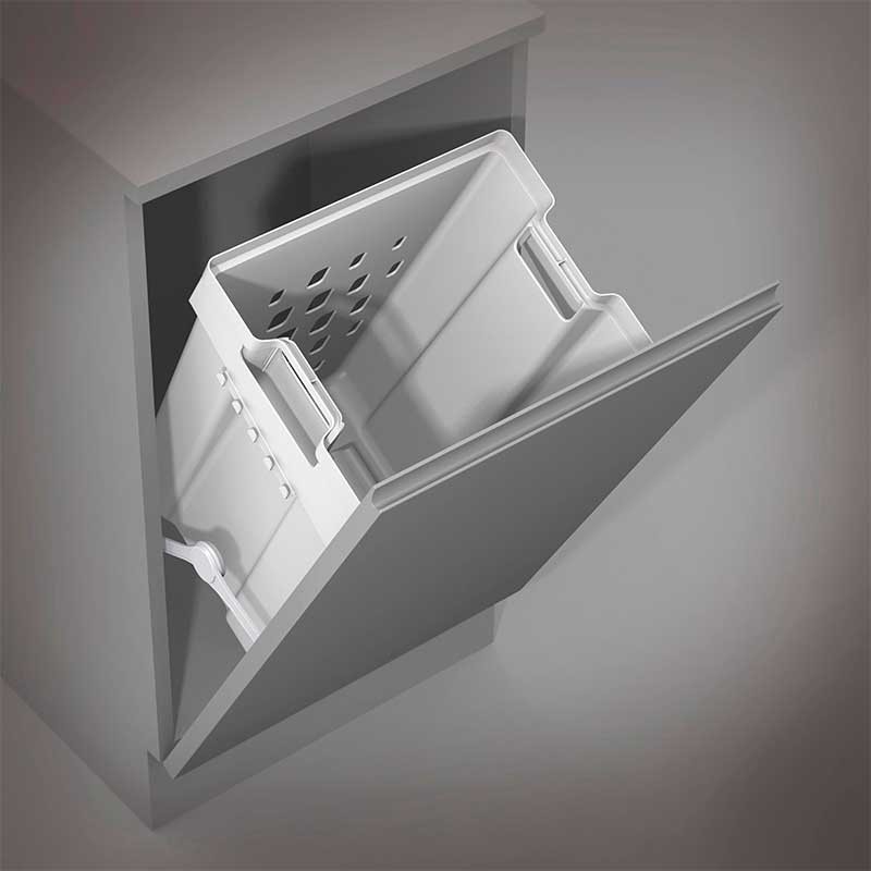 Expanda Cesto basculante de roupa em plástico branco com dobradiça de compasso para instalar na porta de módulos de 450 mm de largura.