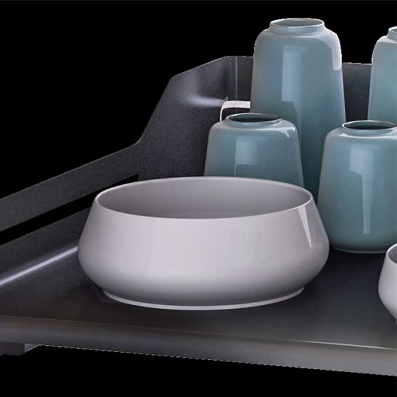 As prateleiras podem ser facilmente removidas para limpeza e são projetadas com a borda fechada, para evitar que as garrafas tombem e pequenos utensílios possam cair. Movimento suave e silencioso.