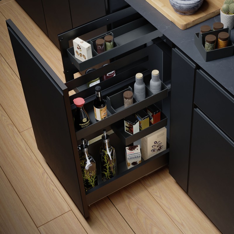 Expanda Acessório despenseiro para móvel de cozinha, projetado para o armazenamento de frascos, especiarias e pequenos recipientes.