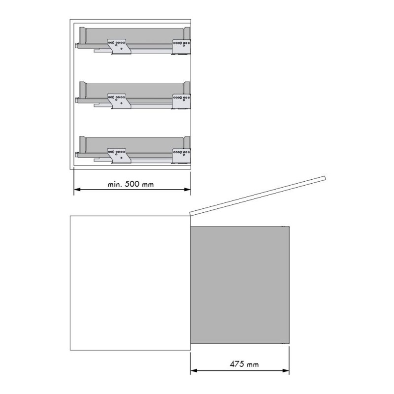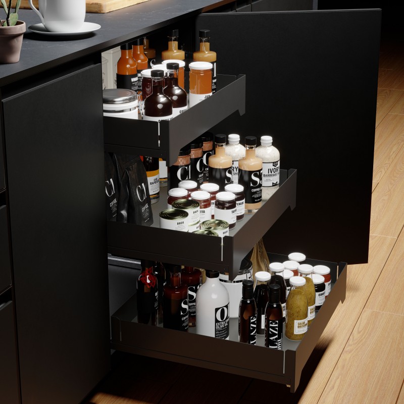Expanda Cesto removível Nova Flat em aço acabamento antracite, com base antiderrapante, guias ocultas, extração total e fechamento amortecido.
