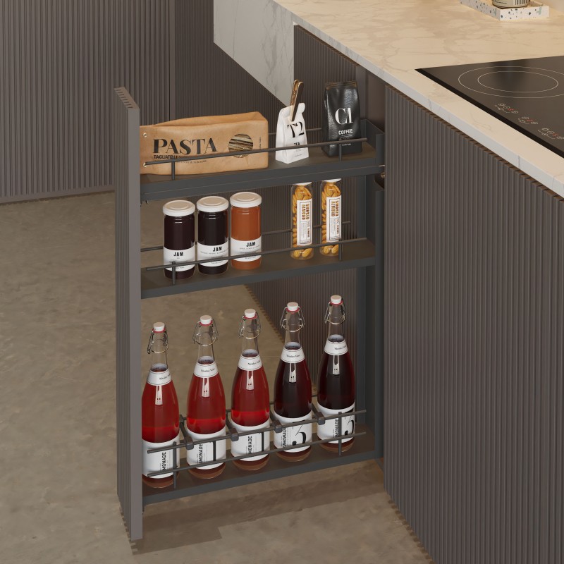 Expanda Suporte para garrafas extraível Compact cor antracite de 3 alturas com bases de melamina, guias ocultas, fechamento amortecido e carga de 30 kg.