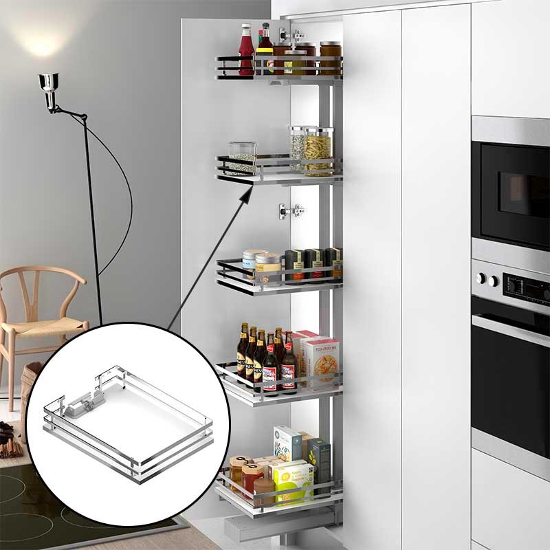 Expanda Kit removível responsável reversível para gabinete coluna cozinha fabricado em aço cromo, cestos com base de melamina, extração total e fecho amortecido.