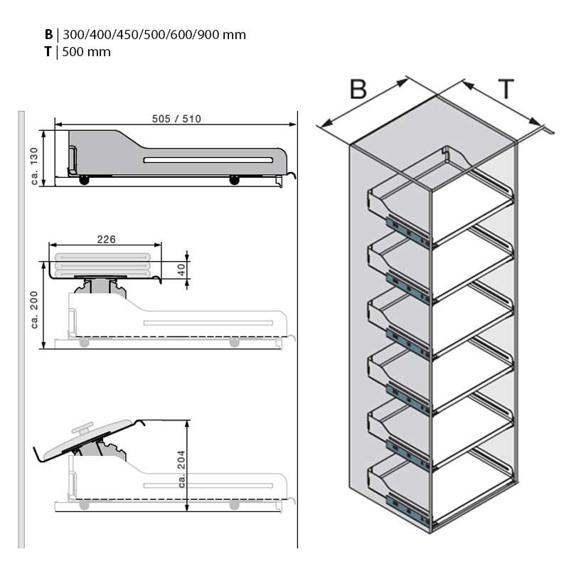 Expanda Sistema de prateleiras LIBELL flexível para todos os tipos de armários sobrepostos também para móveis sem portas e armários com persiana. Guia Grass Dynapro.