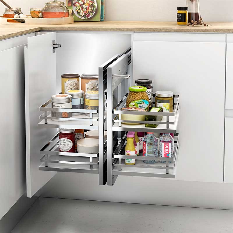 Módulo de quadro removível articulado para móveis de canto de cozinha com uma porta frontal de 400 a 450 mm de largura. Corpo duplo e altura dupla das bandejas para maior capacidade e uso do espaço.