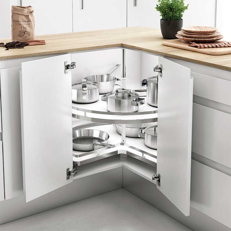 Expanda Modelo rotativo removível Plano em aço cromado com bandeja dupla com base branca de melamina e sistema de freio para móveis de canto de cozinha.