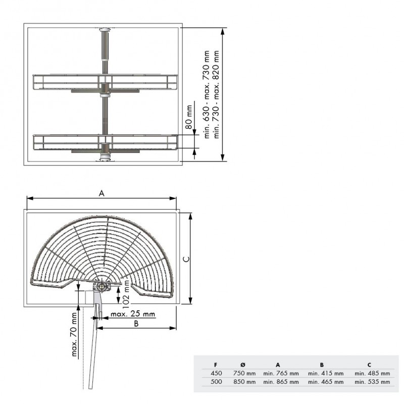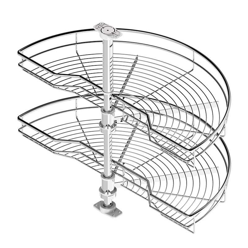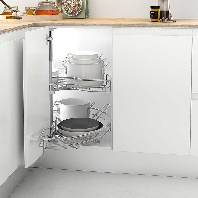 Expanda Extraível circular armário canto da cozinha com duas bandejas, eixo regulável em altura e para uma carga dinâmica de até 20 kg por bandeja.