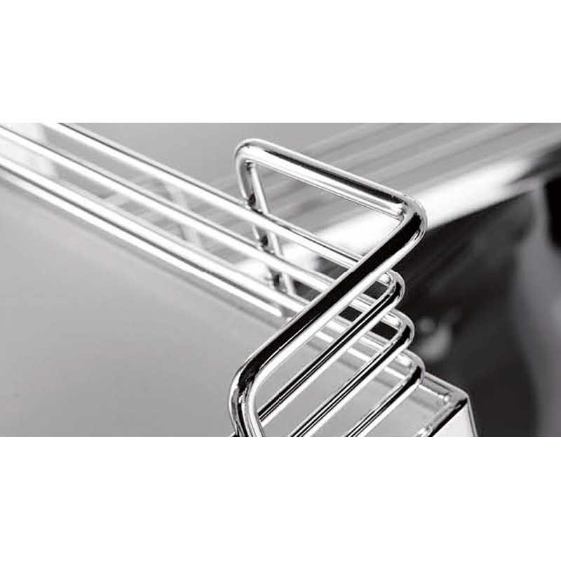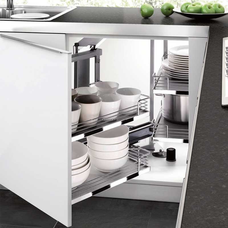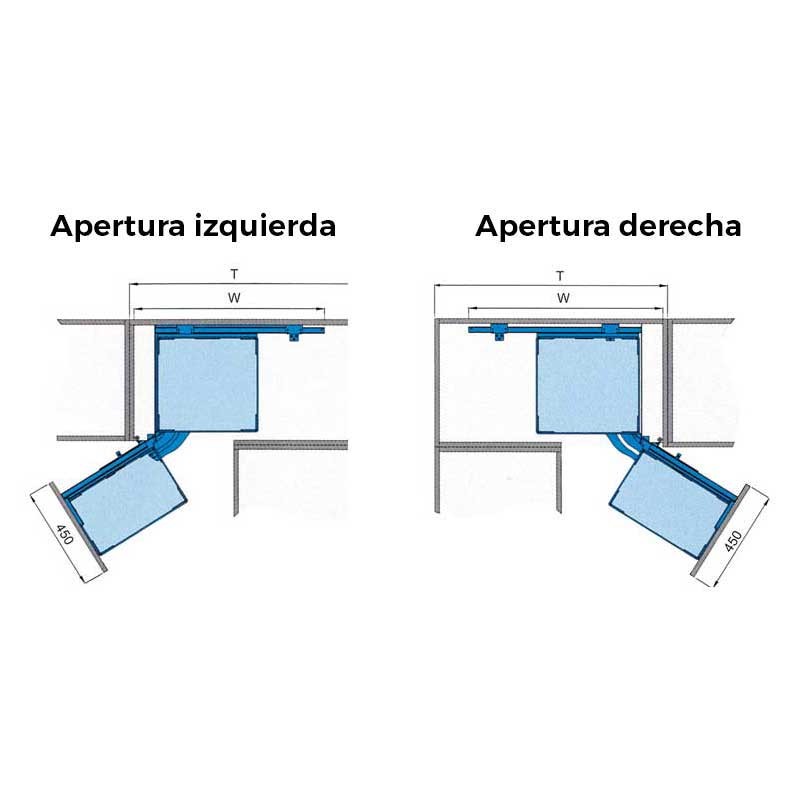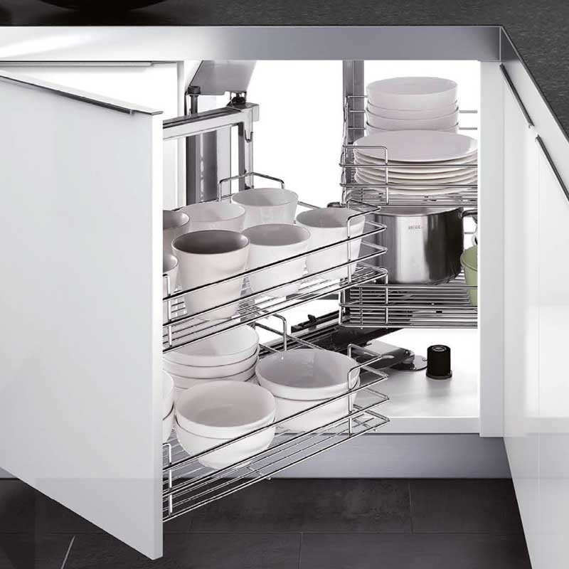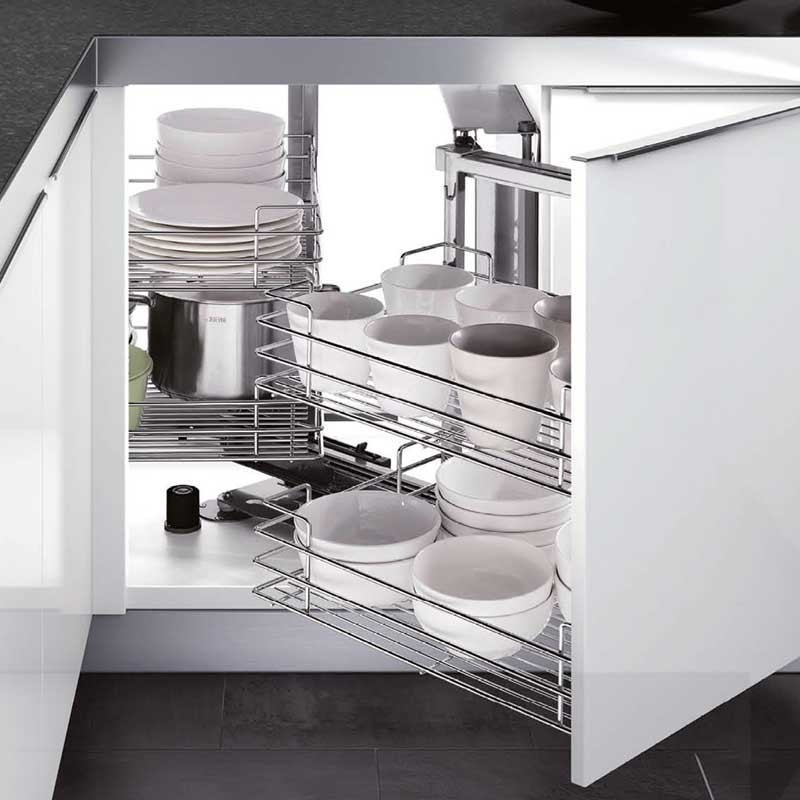 Expanda Módulo carregador frontal de 4 bandejas Magic Corner para armário de canto cego de cozinha de 900 mm de largura mínima e a porta de 450 mm. Bandejas com base de madeira cinza. Abertura de porta em escolher.