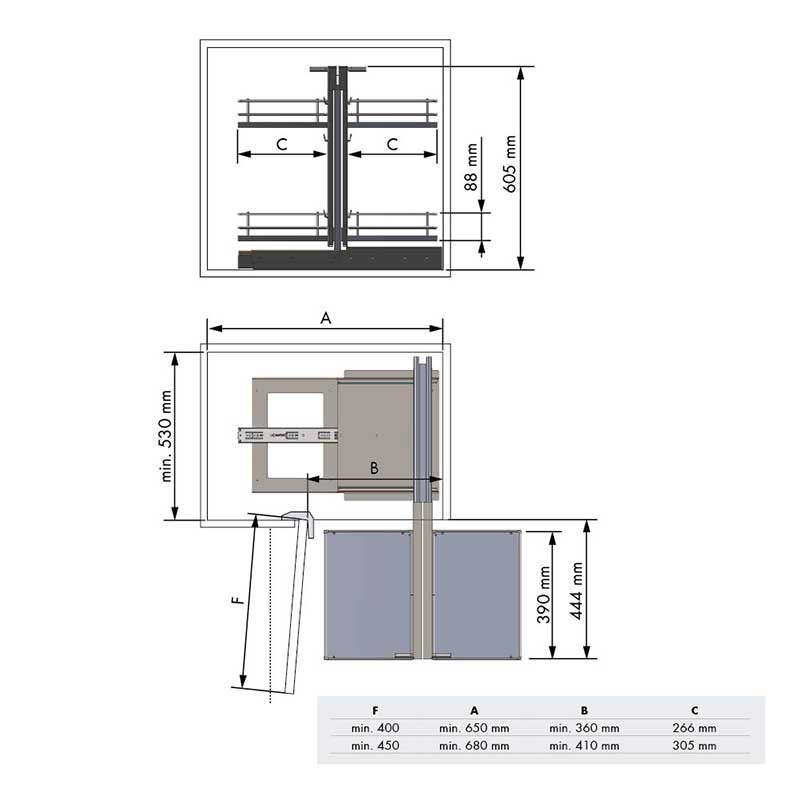 Módulo carcaça extraível articulado para o armário de canto de cozinha. Corpo duplo e duplo-altura de bandejas para uma maior capacidade e melhor aproveitamento do espaço.