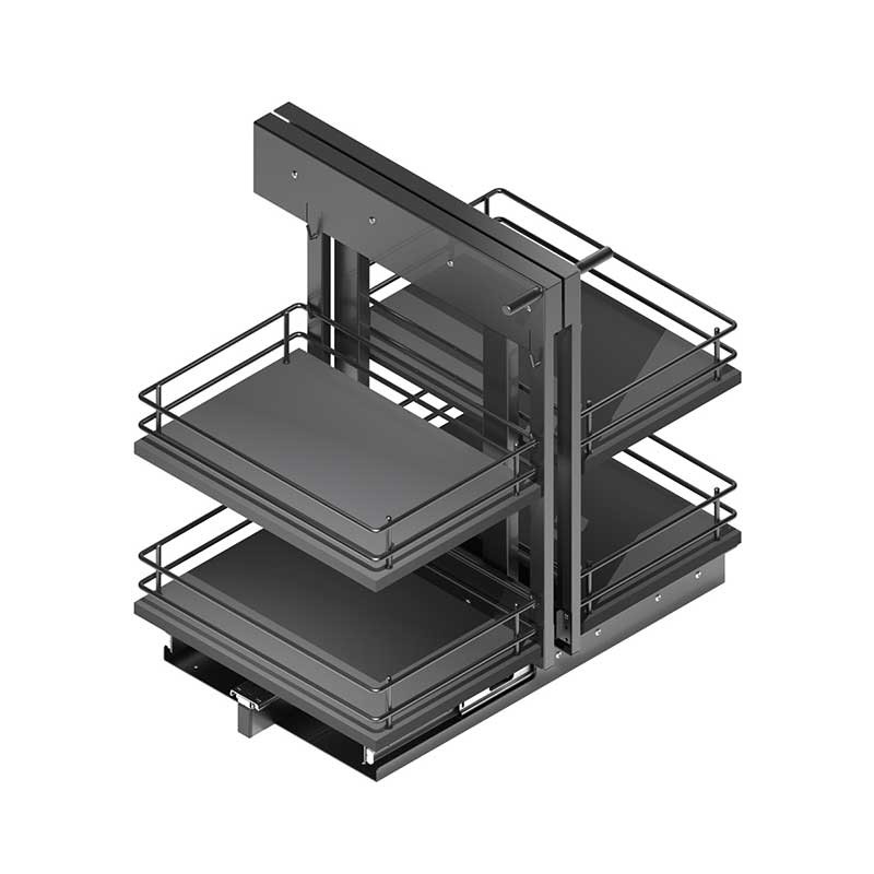 Expanda Extraível articulado acabamento antracite para armário de canto da cozinha, com 4 cestos com base de melamina, extração total e sistema de fecho amortecido.