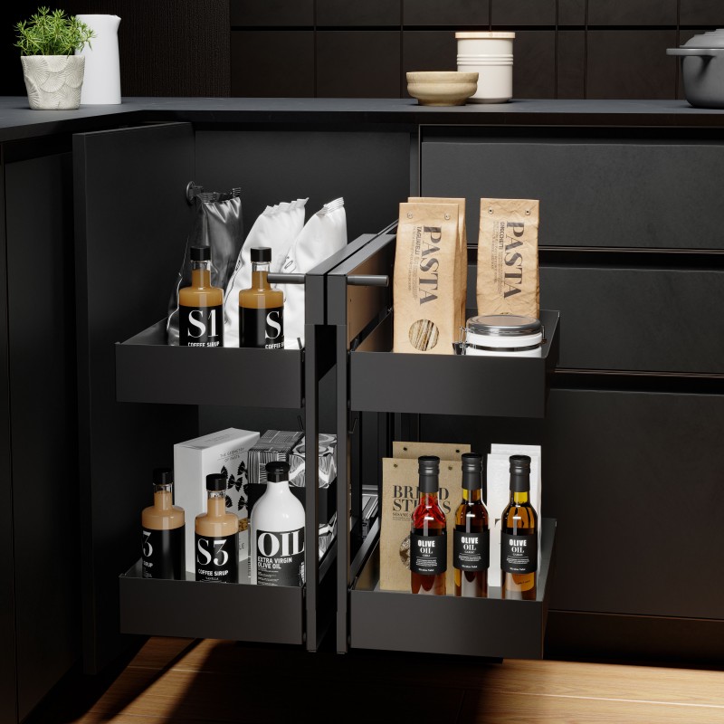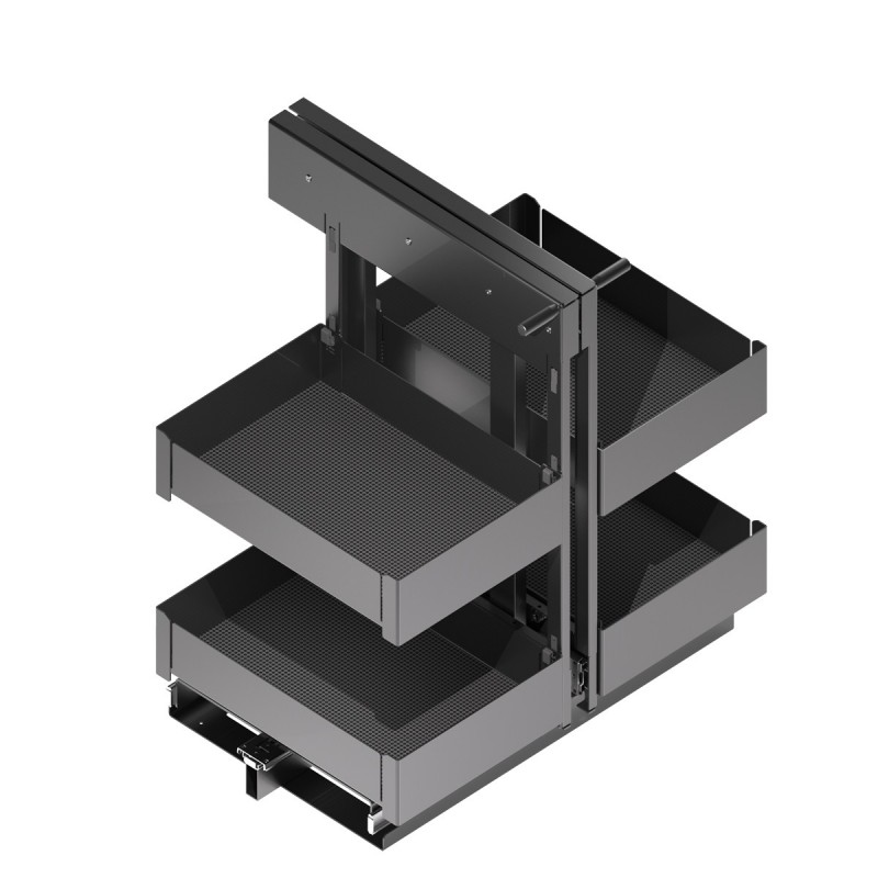 Módulo kit bastidor removível para móvel de canto de cozinha. Seu design de corpo duplo e bandejas de dupla altura permite otimizar o armazenamento e aproveitar ao máximo o espaço interno do móvel.