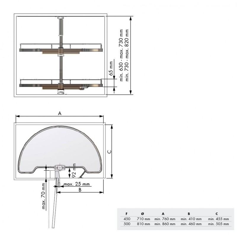 Módulo extraível da gama Compact na cor antracite com bandejas semicirculares de 180º, projetado para móveis de canto de cozinha. Dispõe de dupla altura de bandejas para um aproveitamento ótimo do espaço. Cada bandeja é extraída de forma independente.