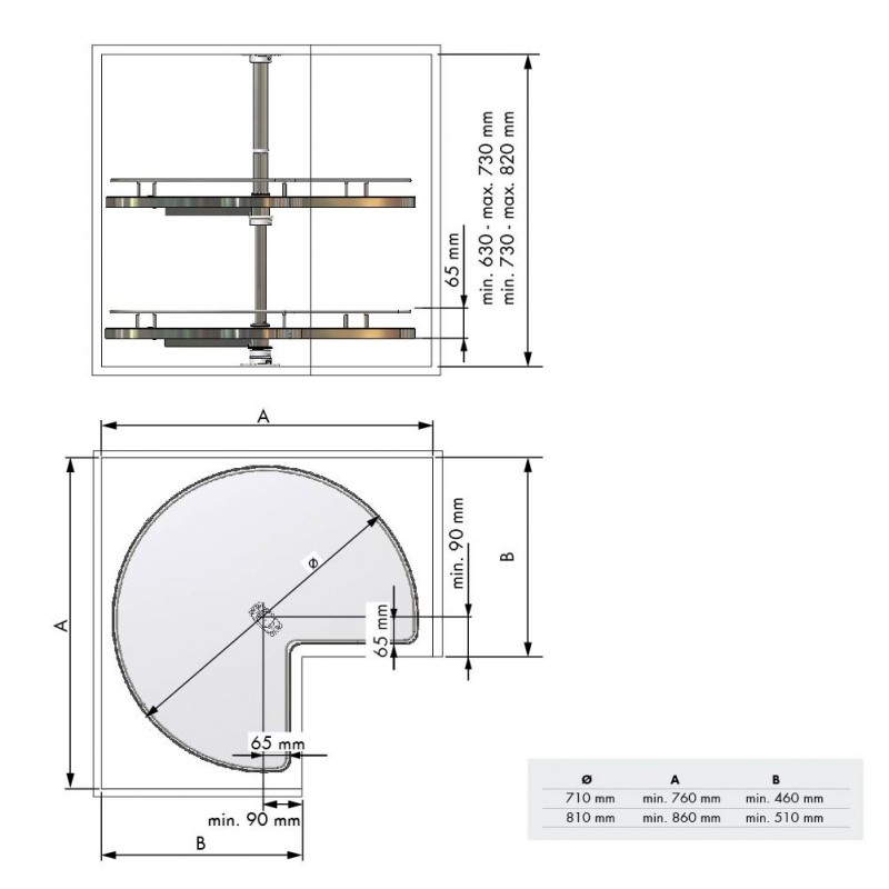 Módulo extraível da gama Compact na cor antracite com bandejas giratórias de 270º, projetado para móveis de canto de cozinha. Dispõe de dupla altura de bandejas para um aproveitamento ótimo do espaço. Cada bandeja gira de maneira independente.