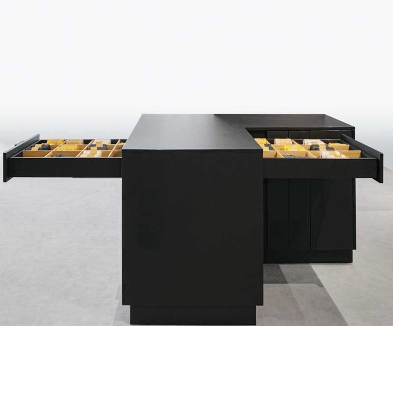 A ferragem RIVERSO, é um sistema que é instalado sobre uma base intermediária reforçada de uma ilha ou península, e assim obter uma gaveta, que pode ser aberta alternadamente de um lado ou do outro.