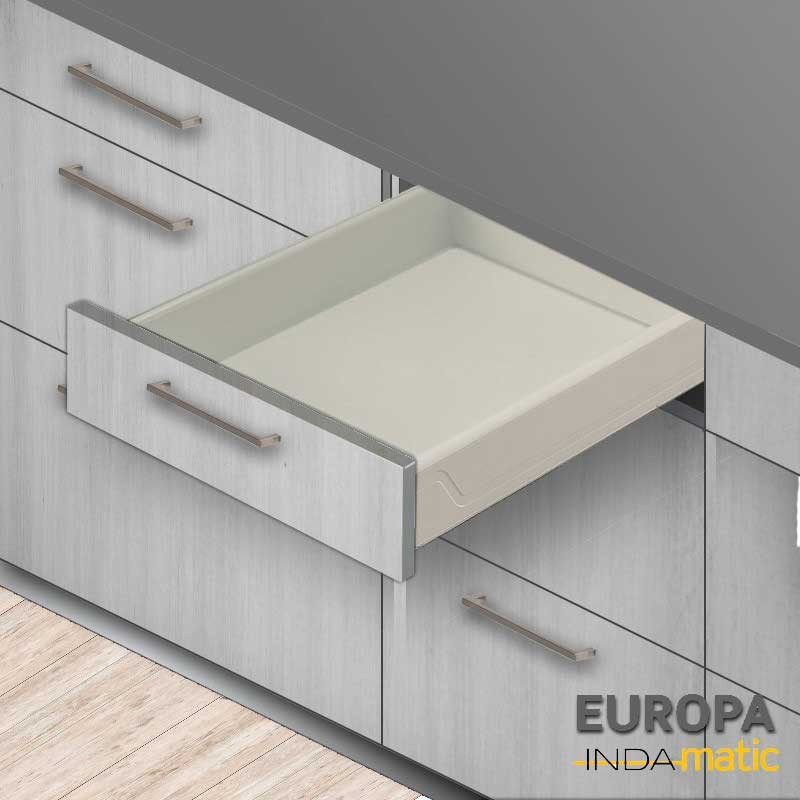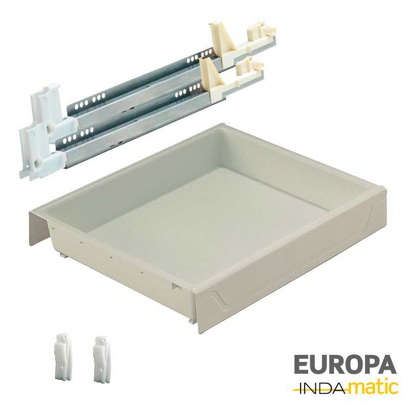 Expanda Gaveta de cozinha Indaux Europa fabricado em PVC injetado na cor branco (RAL 9001) com guias para um fundo padrão de 50 cm e extração parcial.