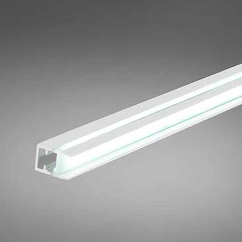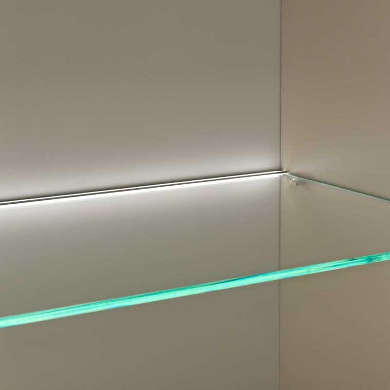 O perfil de policarbonato extrudado contém várias áreas que determinam a cor do filtro de linha (branco ou preto) e deixam 3 partes livres com difusor opal onde a luz LED de 14,4 W/m de seu interior é direcionada em três direções: para cima, para baixo e horizontalmente na espessura (8 mm) da prateleira de vidro.