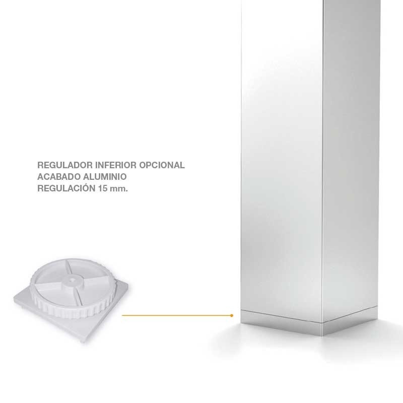 Pé Sob Medida para Península de Cozinha é um suporte quadrado em alumínio anodizado de design moderno, com seção de 80 x 80 mm e altura padrão de 1000 mm. Está disponível em três acabamentos: alumínio, branco mate e preto mate, e pode ser cortado sob medida conforme as necessidades do cliente, indicando a altura desejada ao fazer o pedido. Opcionalmente, pode-se adicionar um regulador inferior com ajuste de 15 mm, disponível apenas no acabamento alumínio. A placa de fixação integrada é fabricada em aço e fornecida nesse acabamento.