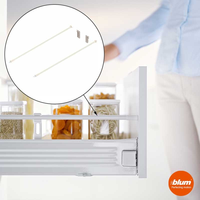 Expanda Conjunto de guarda-corpos longitudinais com suporte de parede traseira para gavetas Blum Metabox altura M (86 mm) de profundidade 50 cm em branco creme.