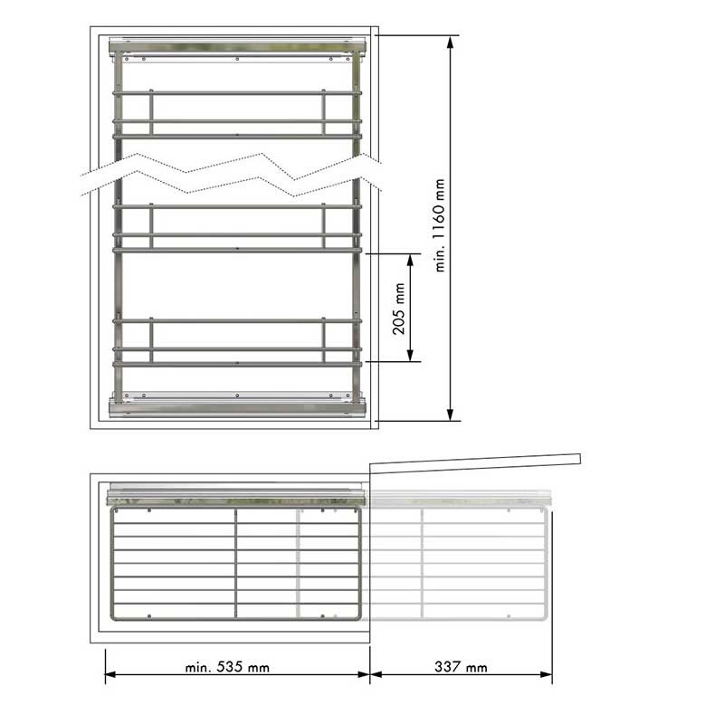 Expanda Carcaça extraível de aço cromado com 5 cestos e guias laterais de extração parcial para carga dinâmica de até 30 kg de peso.