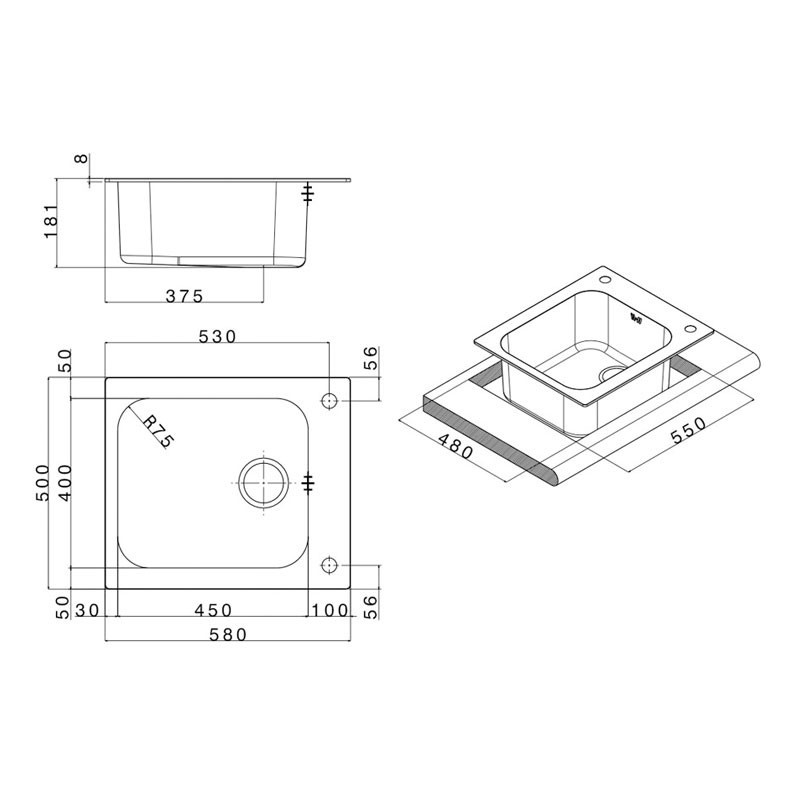 Expanda Pia de aço inoxidável acetinado modelo Roma de 580 x 500 mm para instalação sobre a bancada.