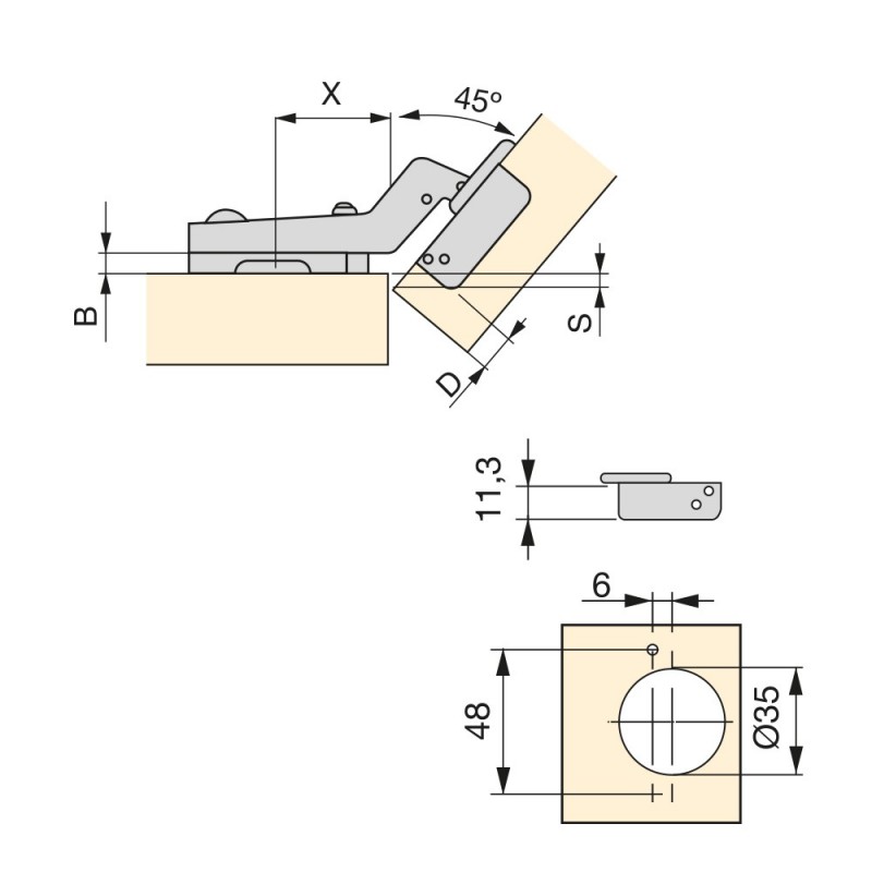 Dobradiças com braços angulares para portas especiais em móveis tipo esquineros ou rinconeros. Destacam-se pela sua pistão amortecedor que proporciona um fechamento suave da porta. Estão disponíveis em versão com braço angular de 45º, com uma abertura de porta de 95º. Para a sua instalação precisam de uma broca aviso de diâmetro 35 mm para caneco. E a sua fixação ao tampo é feita através de parafusos incluídos. Também se distinguem pela sua fácil instalação graças ao sistema automático de montagem em clipe da dobradiça ao suplemento. Além disso, ambos têm de parafuso excêntrico para uma regulação rápida e confortável. A fixação do suplemento se realiza com rosca Euro e que precisa de uma broca aviso de diâmetro 5 x 12 mm, utilizado em placas com zíper de brocas.