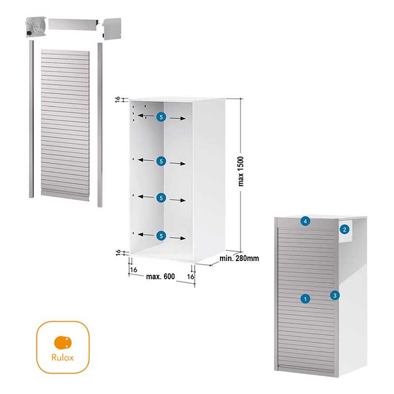 A montagem do kit é simples e rápido de instalar sobre a frente do móvel ao não necessitar de nenhum usinagem especiais além dos furos para fixar o mecanismo de enrolamento e os perfis laterais. Além disso, no caso de ser necessário adaptar a persiana para uma medida em particular, é fácil de fazer através do corte das lamas e a coroa para ajustar a largura, ou os dois perfis laterais em caso de ajustar também a altura.
