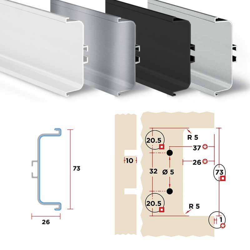 O perfil sistema gola intermediário é instalado entre gavetas ou armários de cozinha, sempre na parte intermediária, nunca na parte superior ou como final de lado.