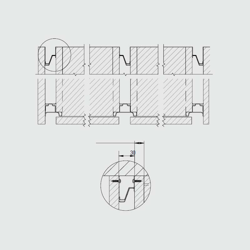Expanda Fixação metálica para perfil puxador gola vertical. Montagem rápida em duas peças para a parte de trás do mobiliário coluna.