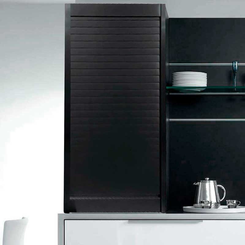 Expanda Persiana em kit fabricada em alumínio com lama de 40 mm Acabamento preto mate com puxador integrado para instalar em móveis de cozinha.